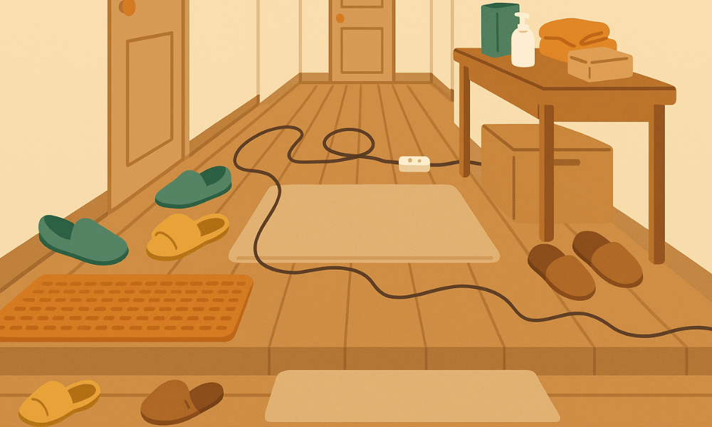 さらに、上がり框をクリアしても、玄関に靴が散らばっていたり、廊下にスリッパが散らばっていると足を取られやすく転倒リスクを高めます。